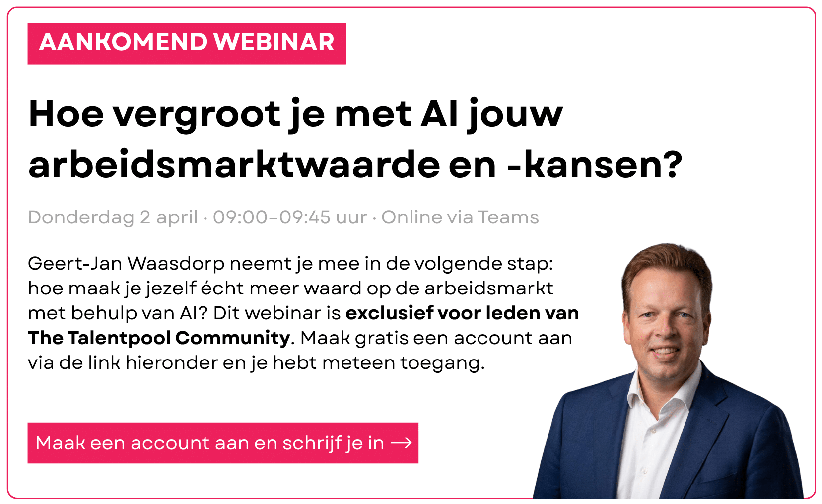 Afgelopen vrijdag gaf arbeidsmarktexpert Geert-Jan Waasdorp (Intelligence Group) een webinar voor The Talentpool Community over hoe werkzoekenden AI kunnen inzetten om slimmer en sneller passende vacatures te vinden. Meer dan 250 deelnemers keken mee. Dit zijn de belangrijkste inzichten en stappen.